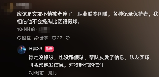 2025-03-13 17:27:59汪嵩再回評論:肯定沒操縱也沒踢假球,隊友買球叫我?guī)退l(fā)信息