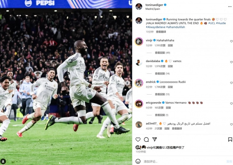 2025-03-13 17:32:14打進致勝點球,呂迪格社媒曬慶祝照:永遠堅持到最后一刻!