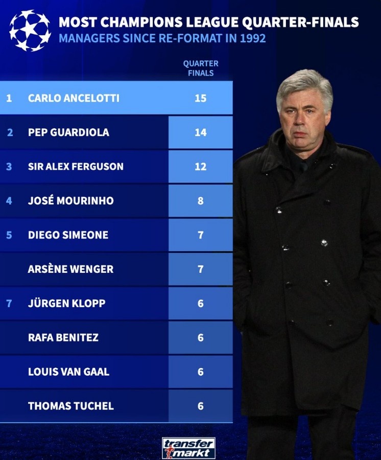2025-03-13 17:32:23歐冠改制后主帥晉級8強次數榜:安切洛蒂15次居首,瓜帥次席
