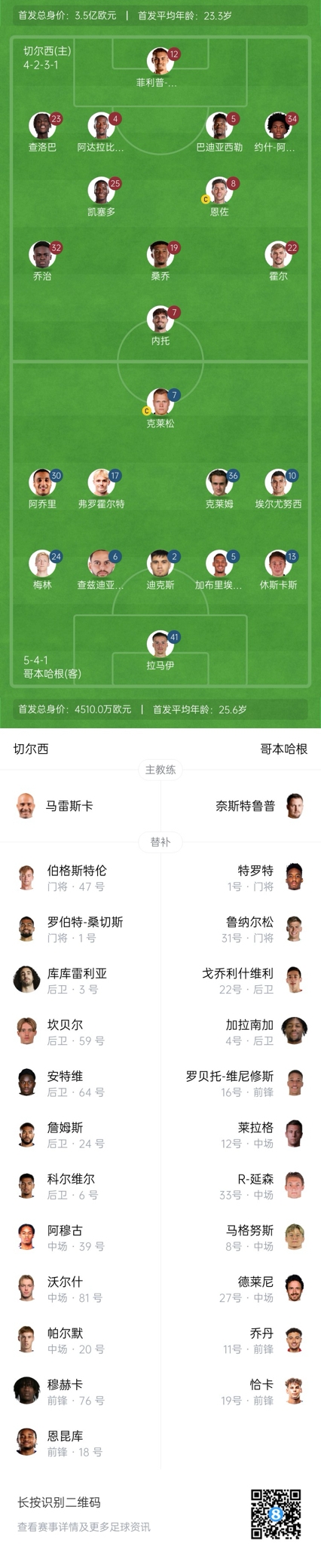 切爾西首發:12-約根森、34-阿奇姆彭、23-查洛巴、4-阿達拉比奧尤、5-巴迪亞西勒、25-凱塞多、8-恩佐-費爾南德斯、32-喬治、22-霍爾、19-桑喬、7-內托