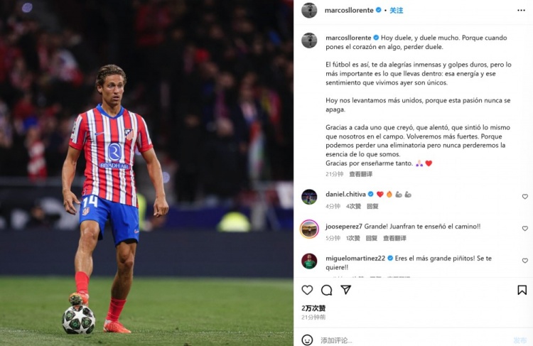 3月14日訊 馬競在本輪歐冠主場被皇馬點球淘汰,出自皇馬青訓的馬科斯-略倫特罰丟點球,他也在今日通過社媒發文。