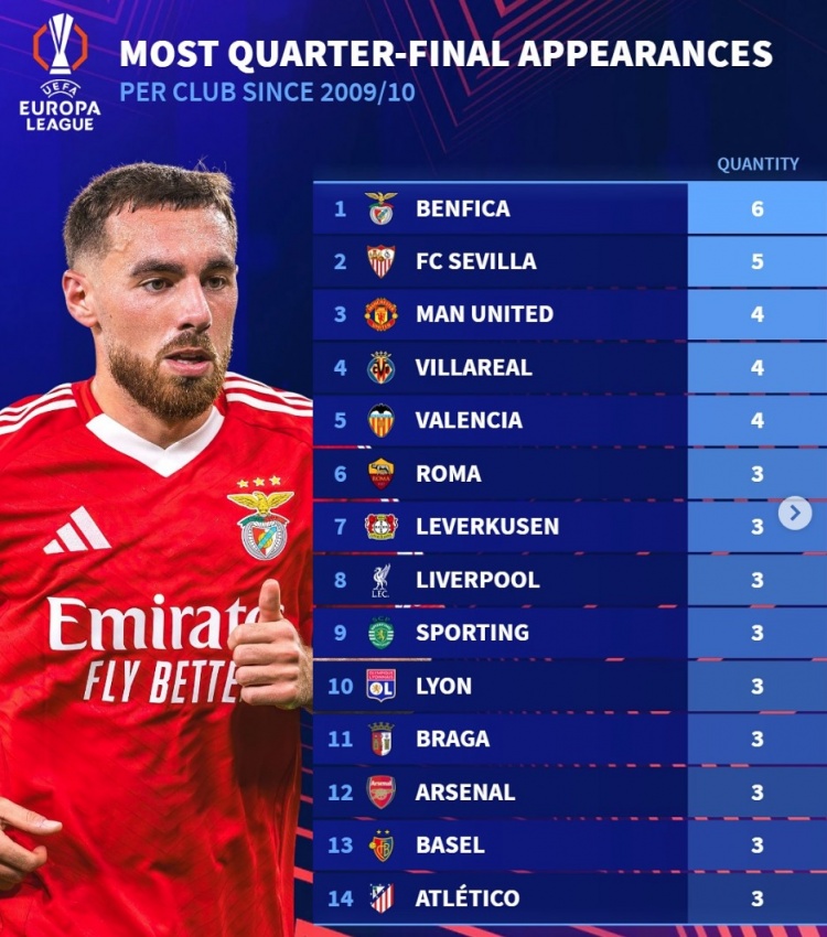 2025-03-14 08:07:55歐聯改制后晉級八強次數榜:塞維利亞5次、曼聯4次,軍槍競各3次
