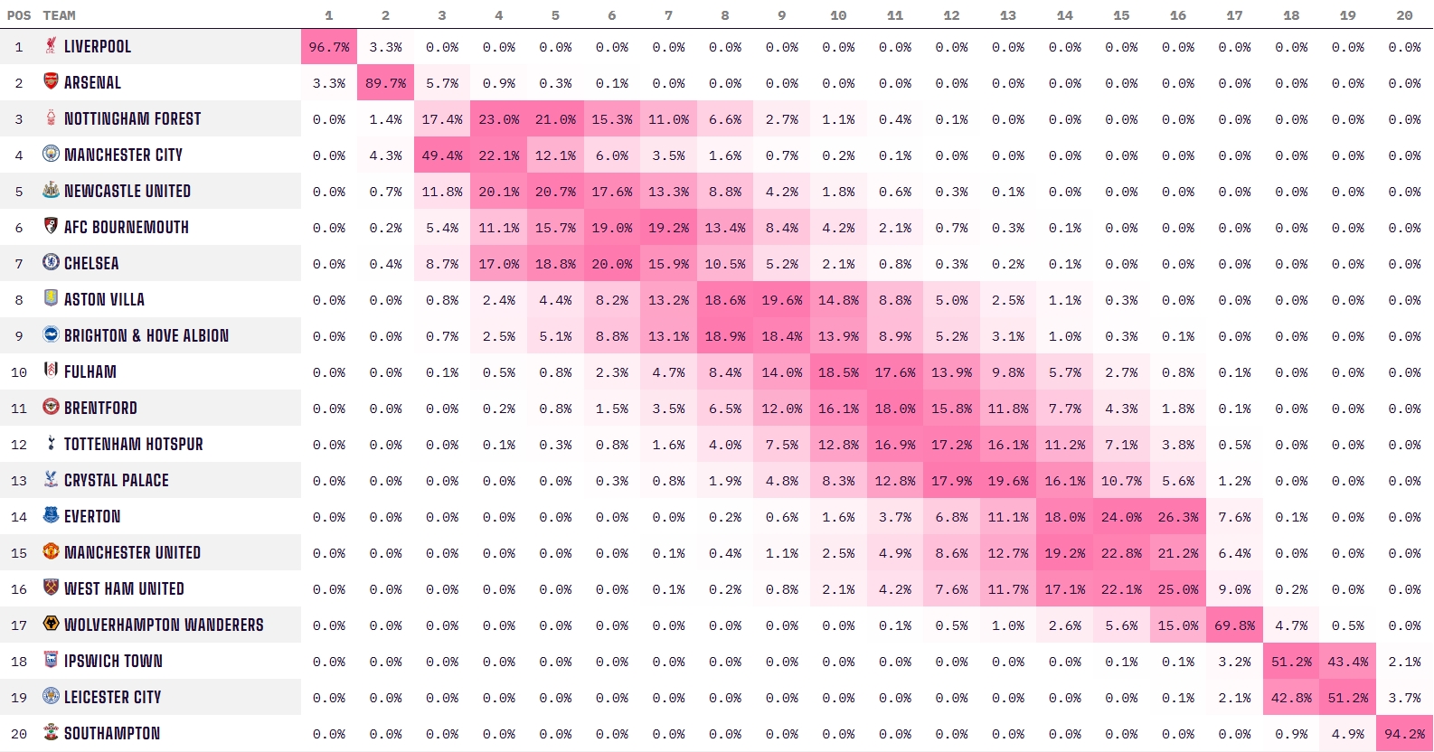 2025-02-24 20:05:48穩了??利物浦最新英超奪冠概率高達96.7%,阿森納3.3% 曼城歸0