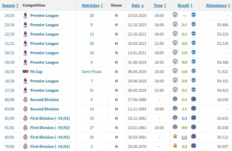 2025-03-15 18:30:2012勝2平,曼城歷史上各項賽事主場對陣布萊頓未嘗敗績
