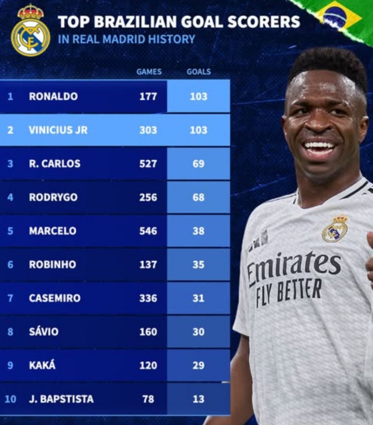 2025-03-16 09:37:43德轉(zhuǎn)列皇馬巴西射手榜:大羅&維尼修斯103球,卡洛斯、卡卡在列