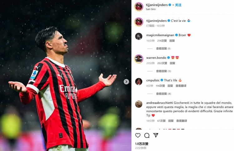2025-03-16 09:40:19傳射助米蘭叕逆轉!賴因德斯社媒曬“無奈攤手”慶祝:這就是生活