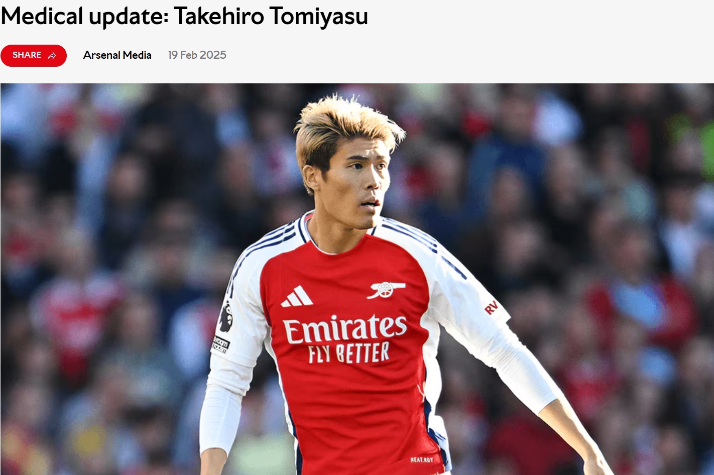 2025-02-19 20:23:19全年報銷!阿森納官方:富安健洋膝蓋再次手術,康復期至今年年底