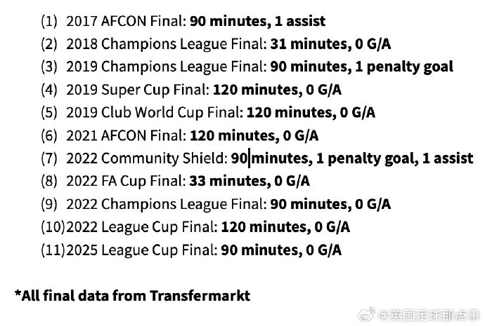 2025-03-17 11:17:47薩拉赫至今代表俱樂部和國家隊參加11場決賽,從未打入非點球進球