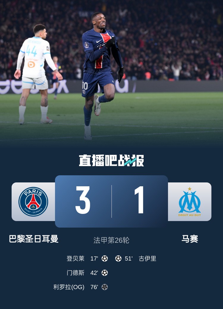 笑傲德比!巴黎3-1馬賽26輪不敗19分領跑 登貝萊法甲賽季第21球