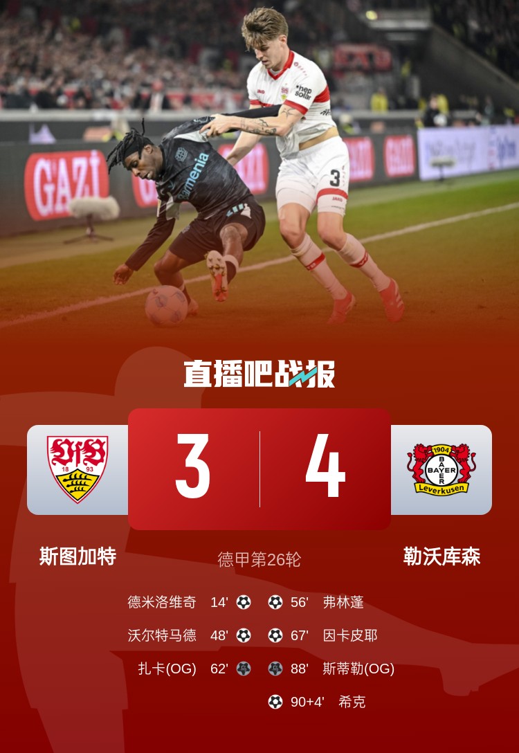 希克補時頭球絕殺,勒沃庫森4-3逆轉斯圖加特。積分榜方面,勒沃庫森落后拜仁6分。