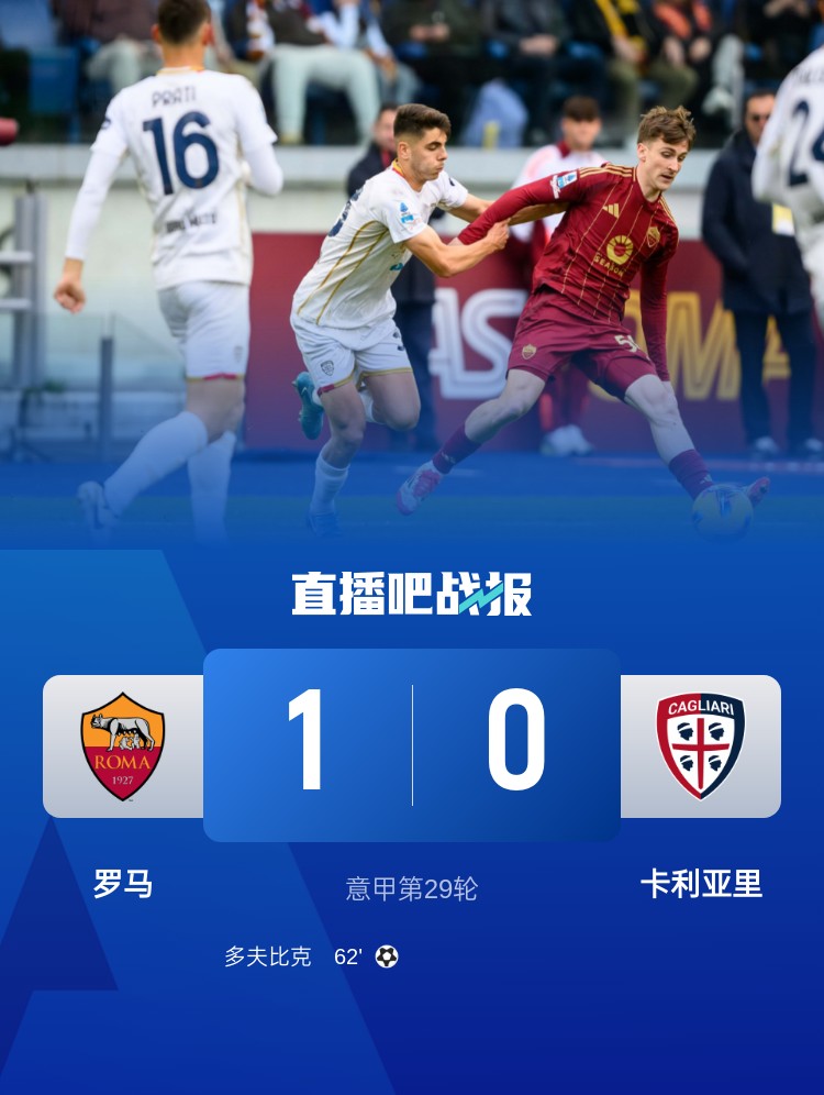 羅馬1-0擊敗卡利亞里,豪取聯賽六連勝,積分榜上超越AC米蘭,升至第七位。