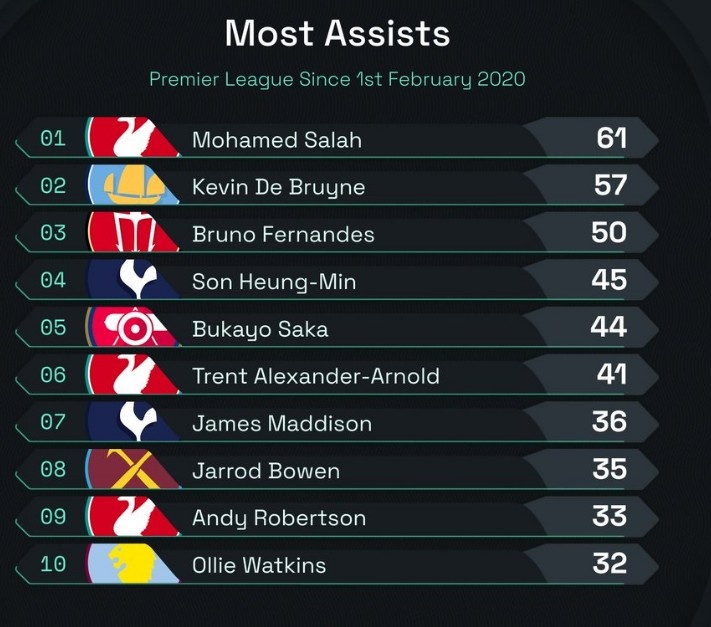 2025-03-17 11:25:17自B費首秀以來英超助攻榜:B費50次第三,僅次于薩拉赫&德布勞內