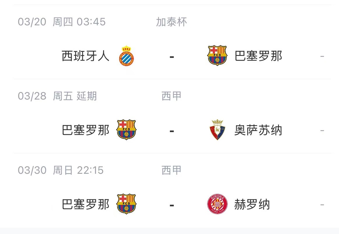 巴薩羅那vs奧薩蘇納比賽具體時間還未確定,目前定于西班牙當地時間27日。這也意味巴薩可能將于本月底面臨三天兩賽。