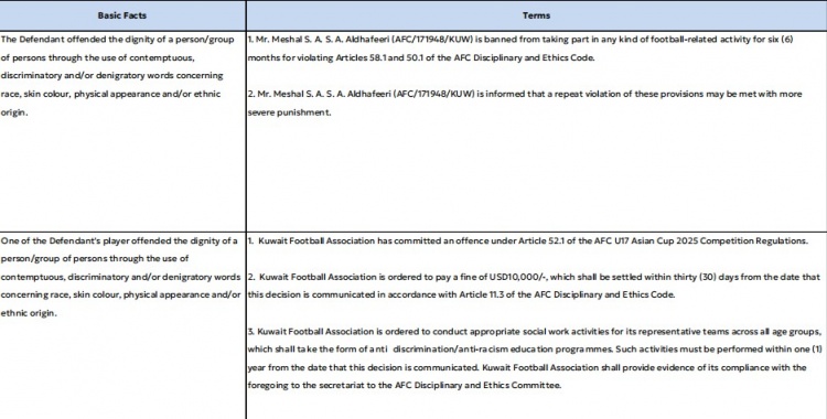 2025-03-17 20:26:45亞足聯:科威特U17球員種族歧視行為被禁賽半年,足協罰款1萬美元