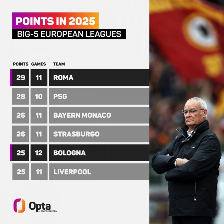 2025-03-18 07:03:25補天!2025五大聯(lián)賽拿分榜:羅馬壓巴黎居首,拜仁、利物浦在列