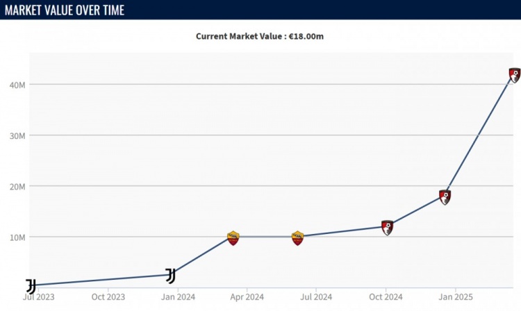 2025-03-18 21:25:37暴漲2400萬(wàn)歐,19歲伯恩茅斯后衛(wèi)懷森身價(jià)已達(dá)4200萬(wàn)歐