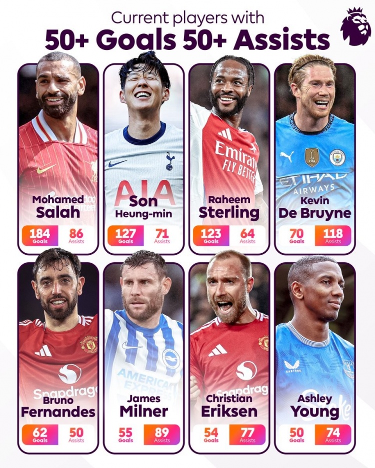 2025-03-19 10:56:52英超當前有8人進球助攻均50+:薩拉赫領銜,孫興慜、B費在列