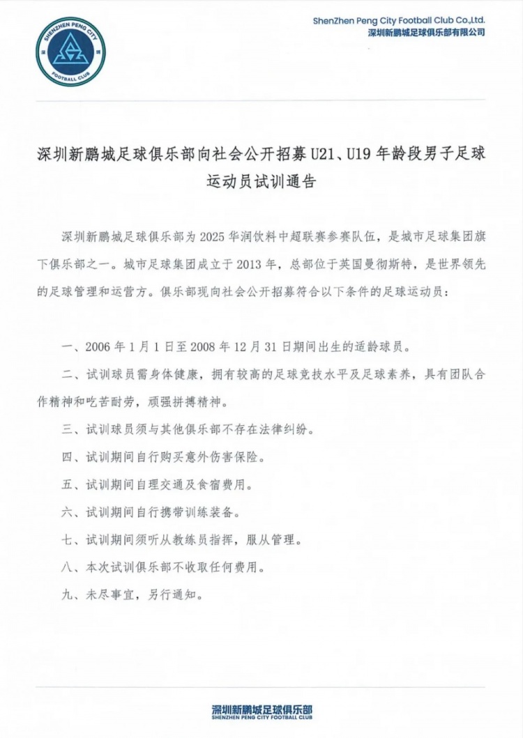 深圳新鵬城足球俱樂部公開招募U21、U19、U17年齡段男子足球運動員試訓通告
