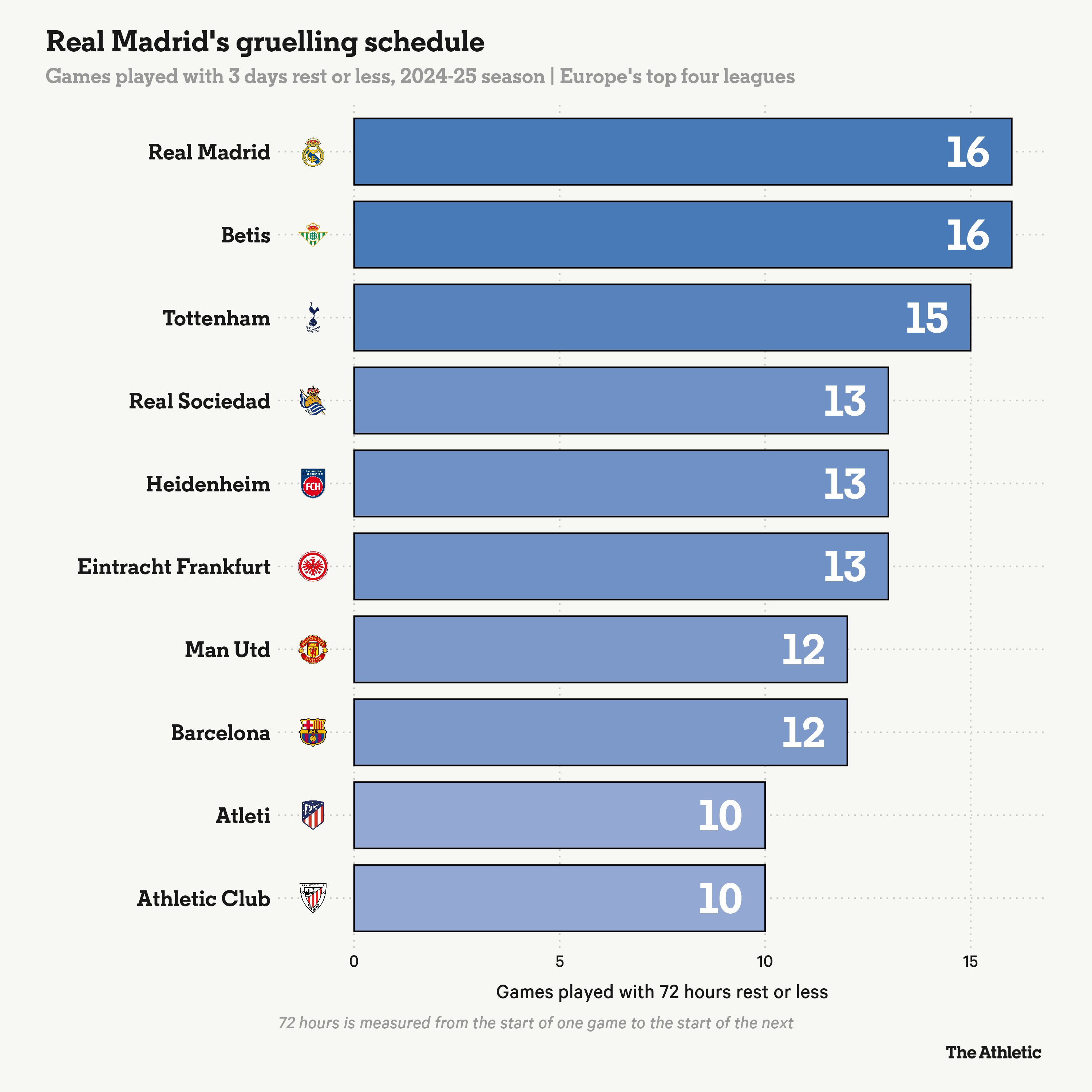 TA統(tǒng)計了本賽季歐洲4大聯(lián)賽球隊的休息情況,皇馬有16場比賽賽前休息時間不多于72個小時,與貝蒂斯并列最多,前十中西甲球隊有6支。