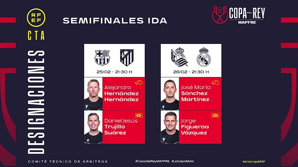 2月25日訊 西班牙足協日前公布了國王杯兩場半決賽首回合的裁判名單,具體如下: