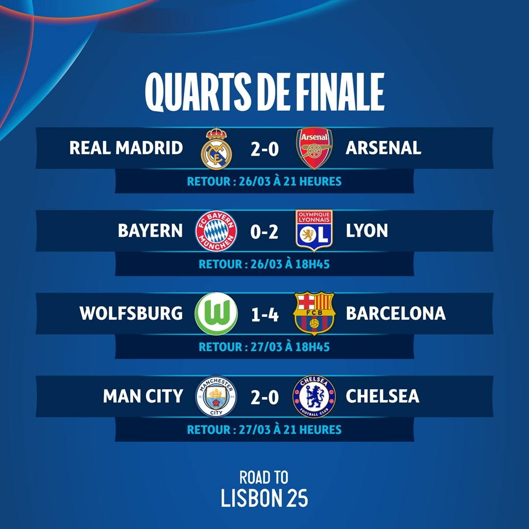 次回合比賽將于下周進行,3月27號里昂女足對陣拜仁女足、阿森納女足對陣皇馬女足,28號巴薩女足對陣沃爾夫斯堡女足、切爾西女足對陣曼城女足。