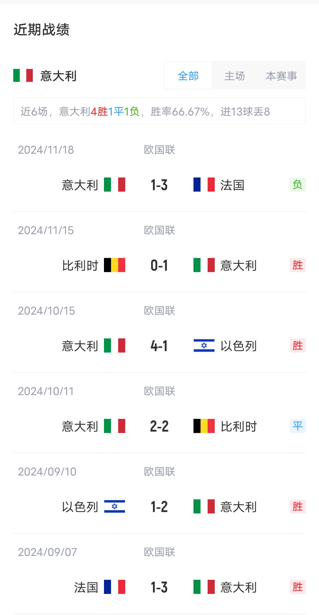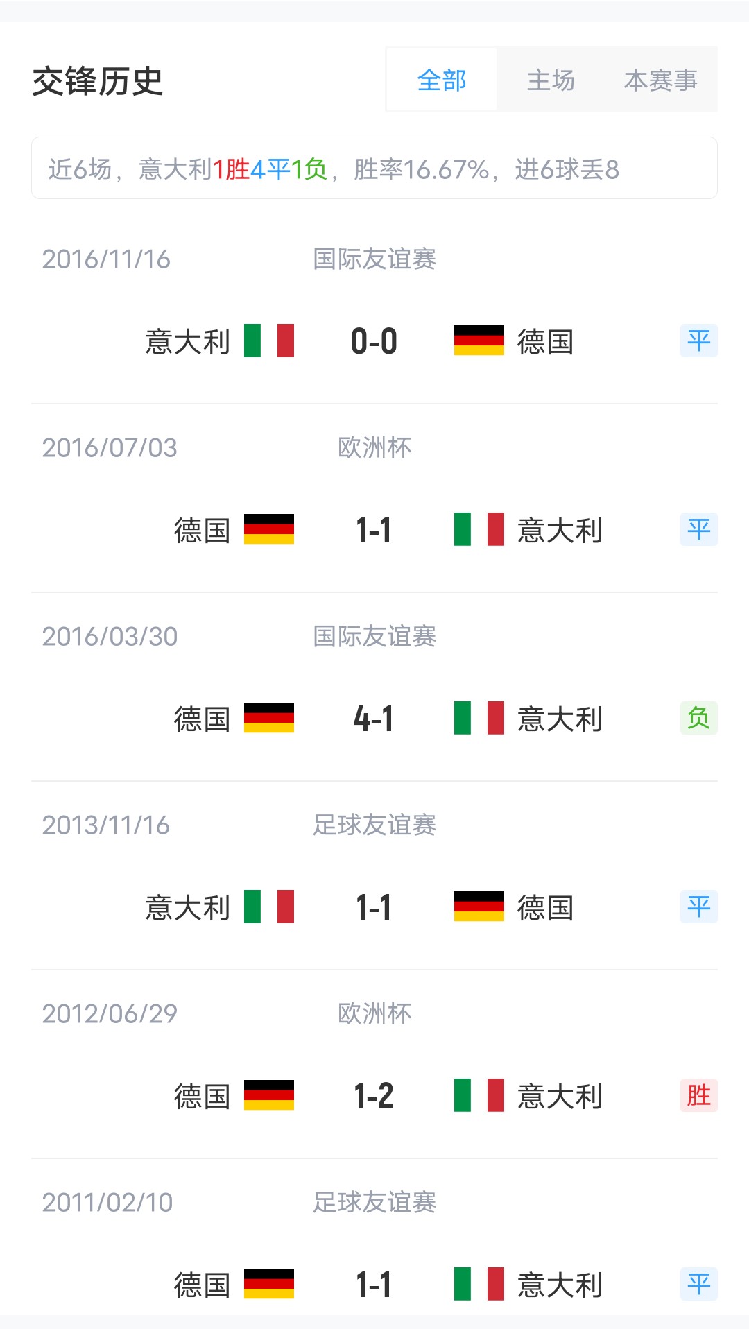 在歐國聯小組賽中,意大利排名B組第2,德國排名C組第1;雙方近6場直接對話中,意大利取得了1勝4平1負的戰績。兩隊最近一次交手,是在2016年11月16日,友誼賽意大利0-0戰平德國。