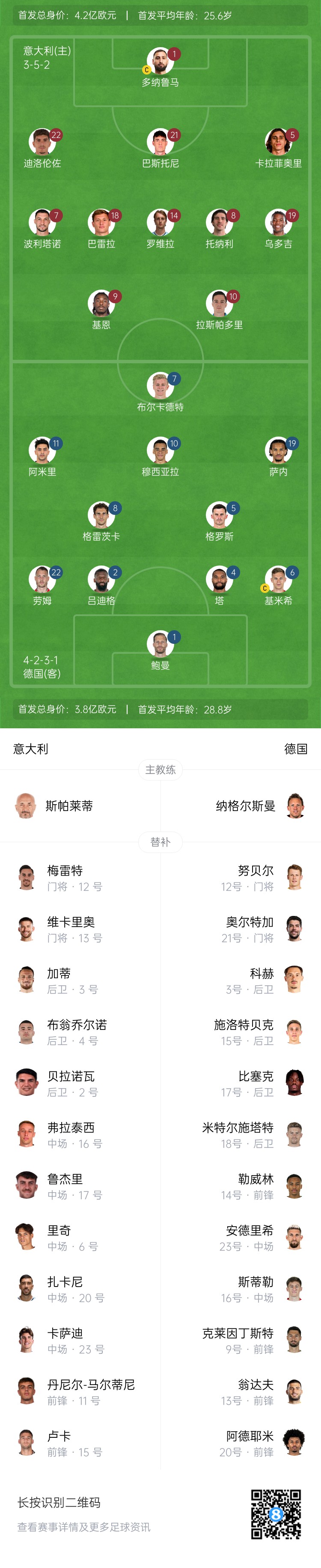 3月21日訊 北京時間今天3點45分,歐國聯1/4賽決賽首回合,意大利主場迎戰德國。賽前雙方公布首發陣容。