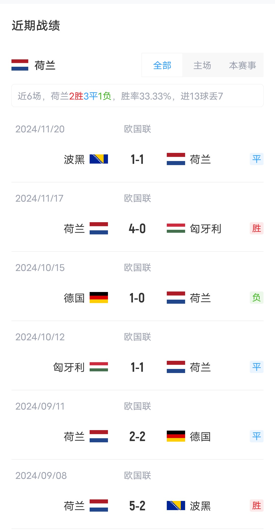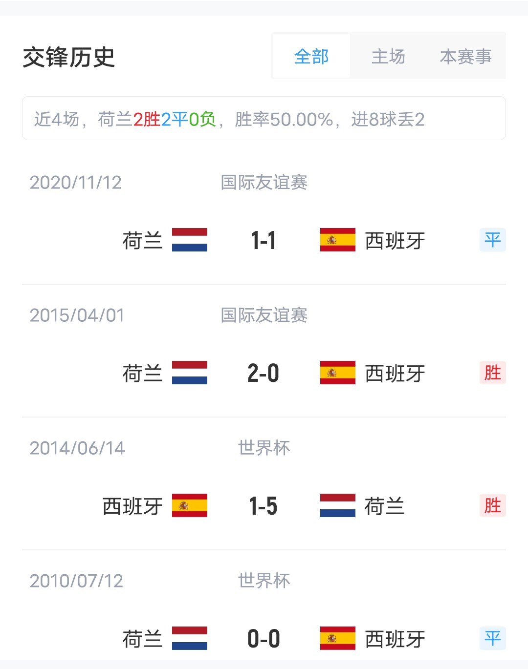 雙方近4場交鋒,荷蘭取得2勝2平的戰績稍居上風。