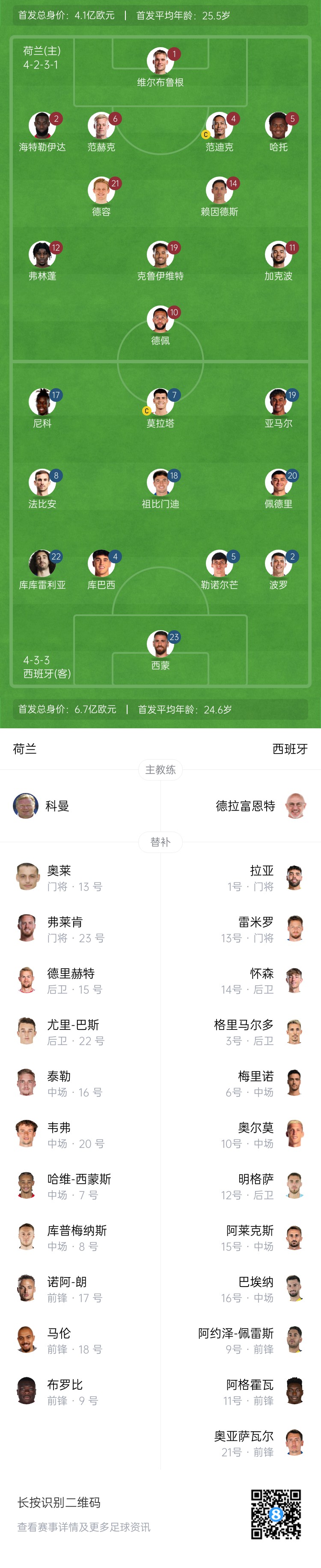 3月21日訊 北京時間03:45,歐國聯1/4賽決賽首回合,荷蘭主場迎戰西班牙。賽前官方公布了雙方的首發名單。