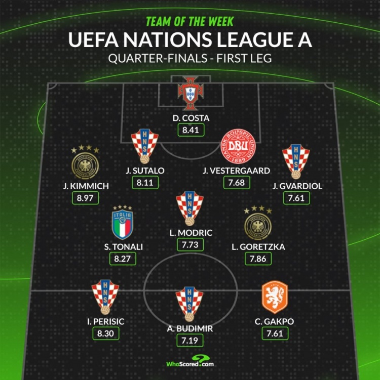 3月21日訊 歐國聯(lián)A級別八強(qiáng)戰(zhàn)首回合已經(jīng)完賽,whoscored也列出了本輪評分最佳陣容,克羅地亞5將在列。