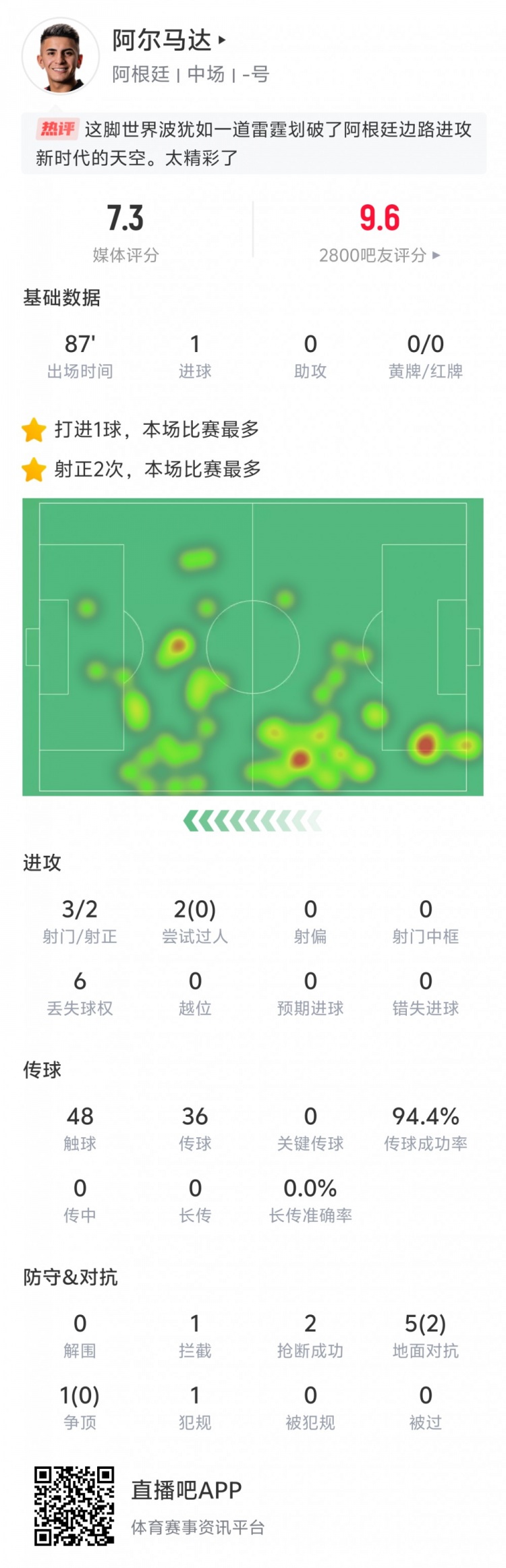 2025-03-22 10:58:56表現(xiàn)出色!阿爾馬達(dá)本場數(shù)據(jù):打入世界波,傳球成功率94.4%
