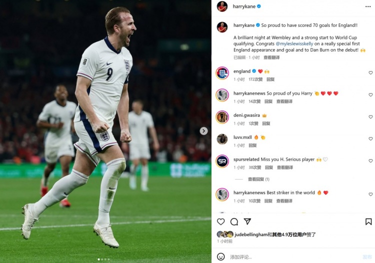 2025-03-22 10:59:05凱恩社媒曬照:自豪打進在英格蘭的第70球,祝賀斯凱利首秀破門