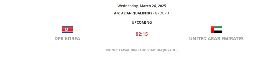2025-03-22 10:59:18亞足聯(lián)官網(wǎng)顯示:朝鮮主場對陣阿聯(lián)酋的比賽,將在沙特利雅得進(jìn)行