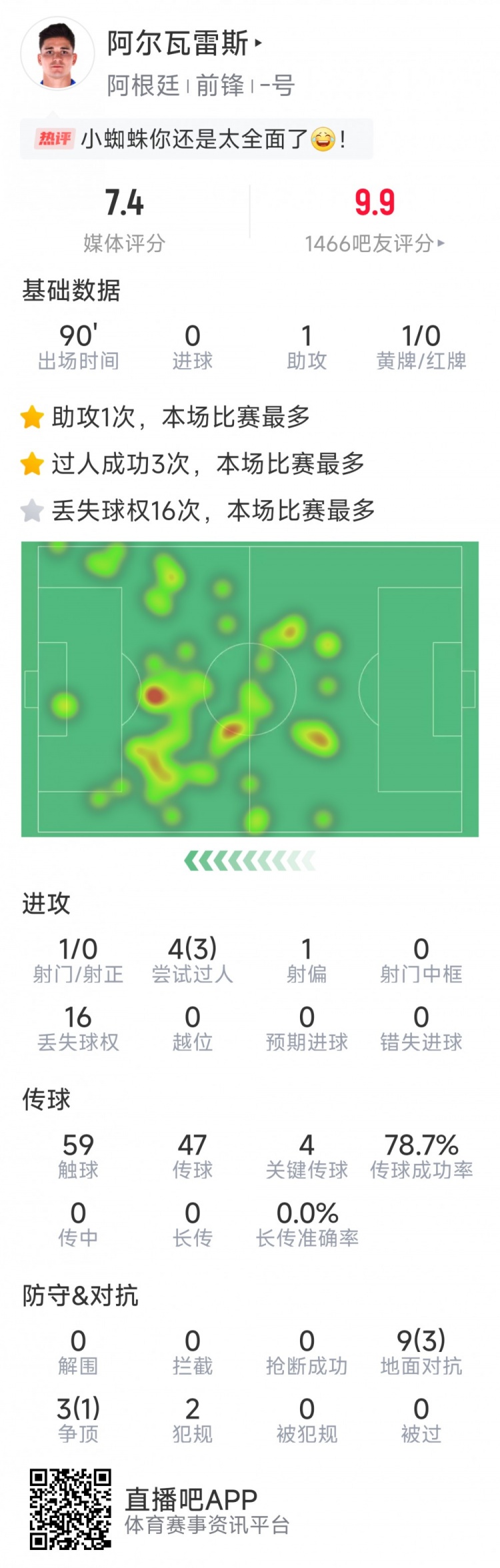2025-03-22 10:59:27阿爾瓦雷斯本場數據:1次助攻,4次關鍵傳球,3次成功過人