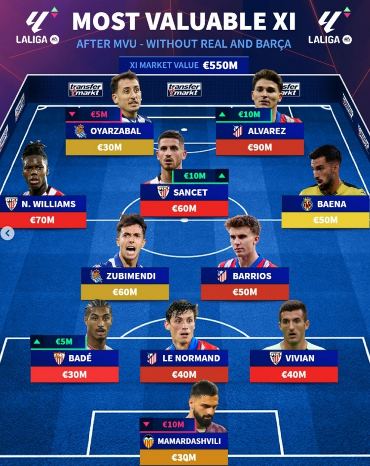 3月22日訊 德轉(zhuǎn)更新了西甲球員身價(jià),并盤點(diǎn)了除皇馬、巴薩球員之外的西甲最貴陣容,其中阿爾瓦雷斯領(lǐng)銜馬競(jìng)3人在列,具體如下: