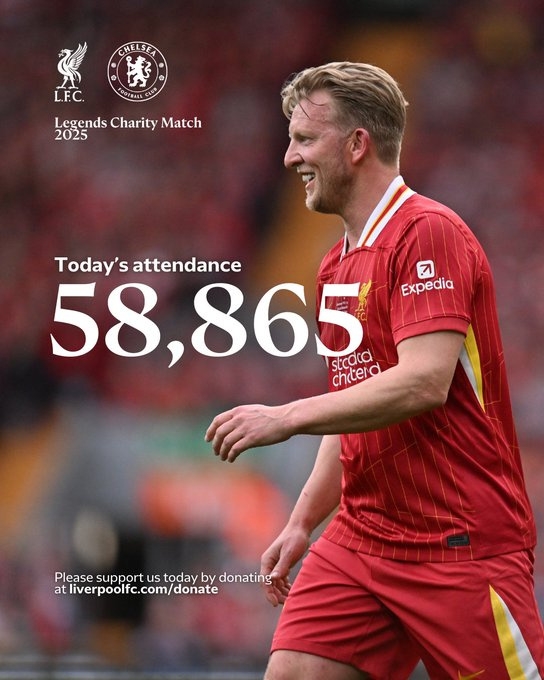2025-03-23 01:48:05捧場!利物浦vs切爾西傳奇慈善賽現場共計有58865名觀眾