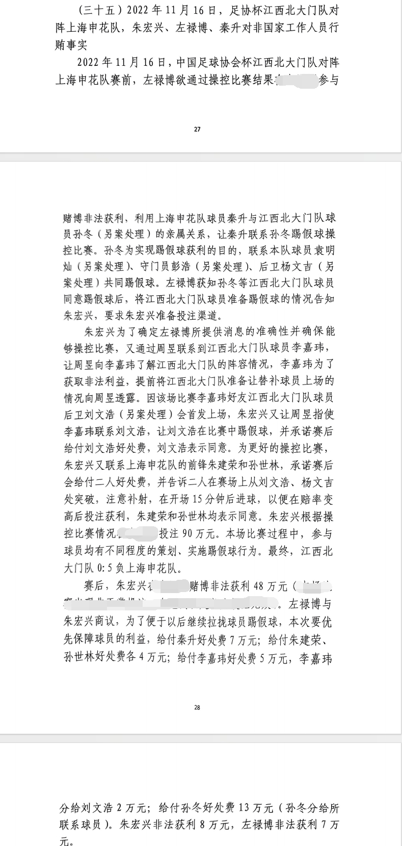 2022年11月16日,足協(xié)杯江西北大門隊(duì)對(duì)陣上海申花隊(duì)、朱宏興、左祿博、秦升對(duì)非國家工作人員行賄事實(shí)