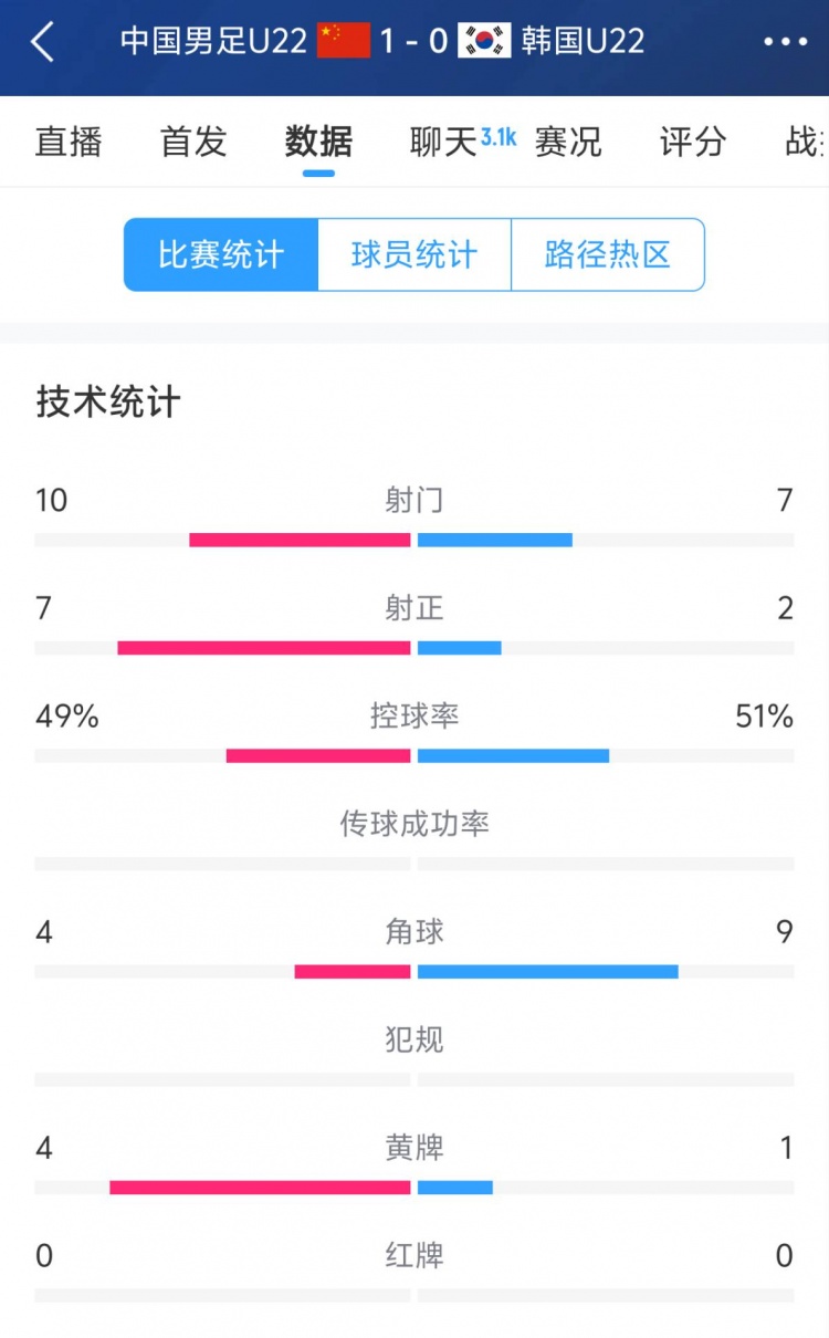 2025-03-23 20:24:49U22國足1-0韓國全場數據:控球率49%落后韓國,10射7正領先對手