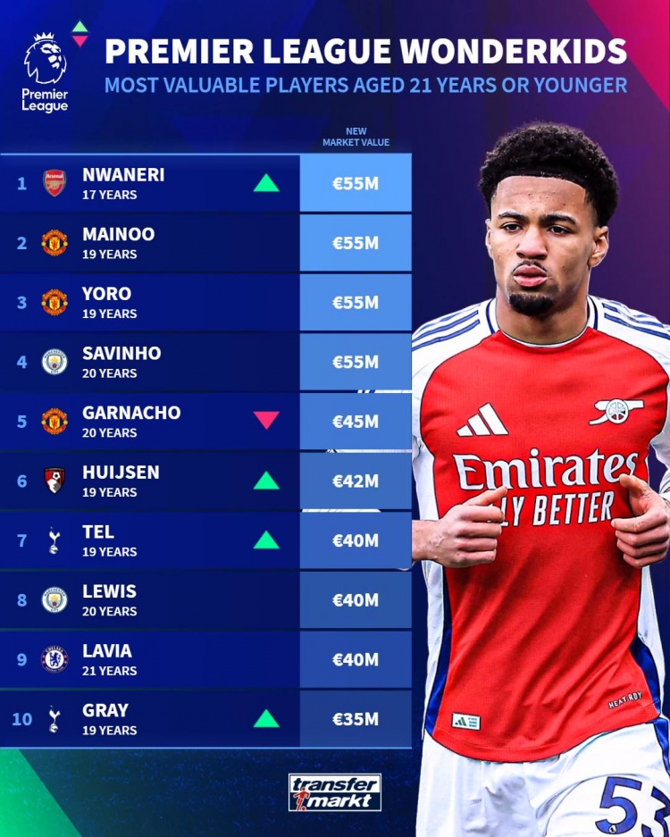 2025-03-23 20:26:12英超U21身價榜:恩瓦內(nèi)里、梅努、約羅、薩維尼奧5500萬歐居首
