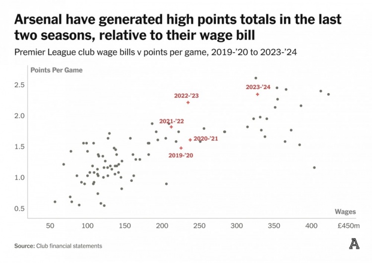 阿森納的高薪資,也助力他們拿到了更高的聯賽積分
