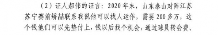 2020年末,山東泰山對(duì)陣江蘇蘇寧賽前矯喆聯(lián)系我說(shuō)他可以找人運(yùn)作,需要200多萬(wàn),這個(gè)錢他們可以先墊付上,錢以后找個(gè)機(jī)會(huì),通過(guò)球員轉(zhuǎn)會(huì)費(fèi)、簽字費(fèi)把錢賺回來(lái),我同意了,矯喆就去做江蘇球員“工作”,加上我這邊讓球員全力以赴去踢,最終這場(chǎng)比賽的比分是山東泰山隊(duì)2-0江蘇蘇寧,我們(足協(xié)杯)奪冠了。矯喆和我說(shuō)他們運(yùn)作這場(chǎng)球花了200萬(wàn),這個(gè)錢是矯喆他們出的。我沒(méi)有主動(dòng)還過(guò)這個(gè)錢,但是我把矯喆招到我們隊(duì)當(dāng)助理教練了,給他找了個(gè)工作,也算是還他幫我的運(yùn)作這場(chǎng)比賽的人情了。