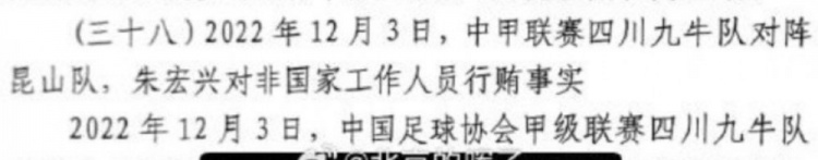 2022年12月3日,中甲聯賽四川九牛隊對陣昆山隊,朱宏興對非國家工作人員行賄事實。