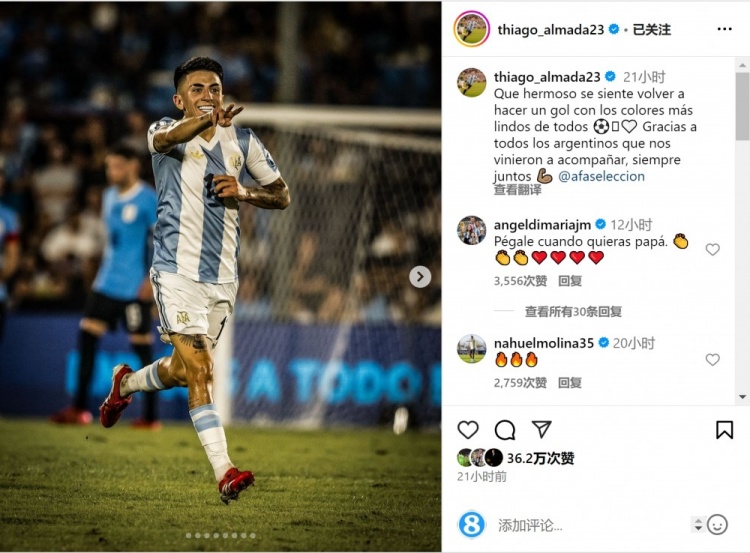 2025-03-23 20:34:36阿爾馬達社媒慶祝進球,迪馬利亞留言:隨時轟一腳吧!