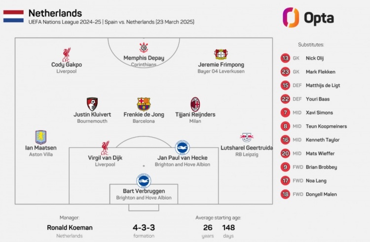 2025-03-24 06:14:052017年11月9日以來,荷蘭首發陣容首次無荷甲球員