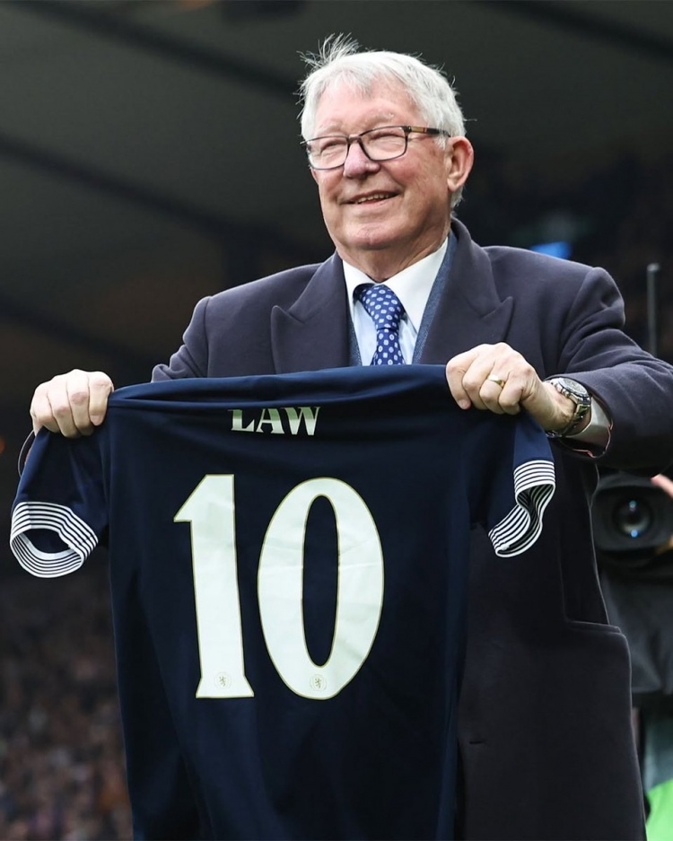 2025-03-24 19:28:05致敬傳奇,弗格森在蘇格蘭比賽前手舉丹尼斯-勞球衣
