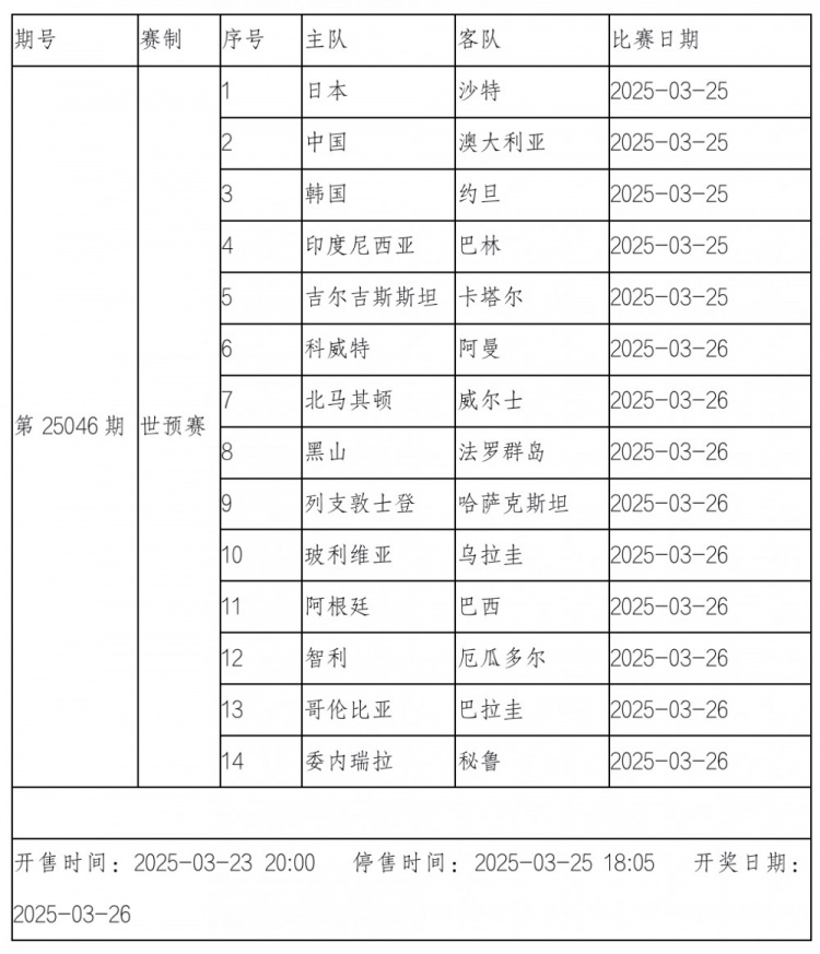 傳足勝負彩第25046期競猜賽事為亞洲區、歐洲區和南美區的世界杯預選賽。本期,亞洲區中國、日本和韓國東亞三強將分別在主場對陣澳大利亞、沙特和約旦,南美區則迎來阿根廷VS巴西的重頭戲。