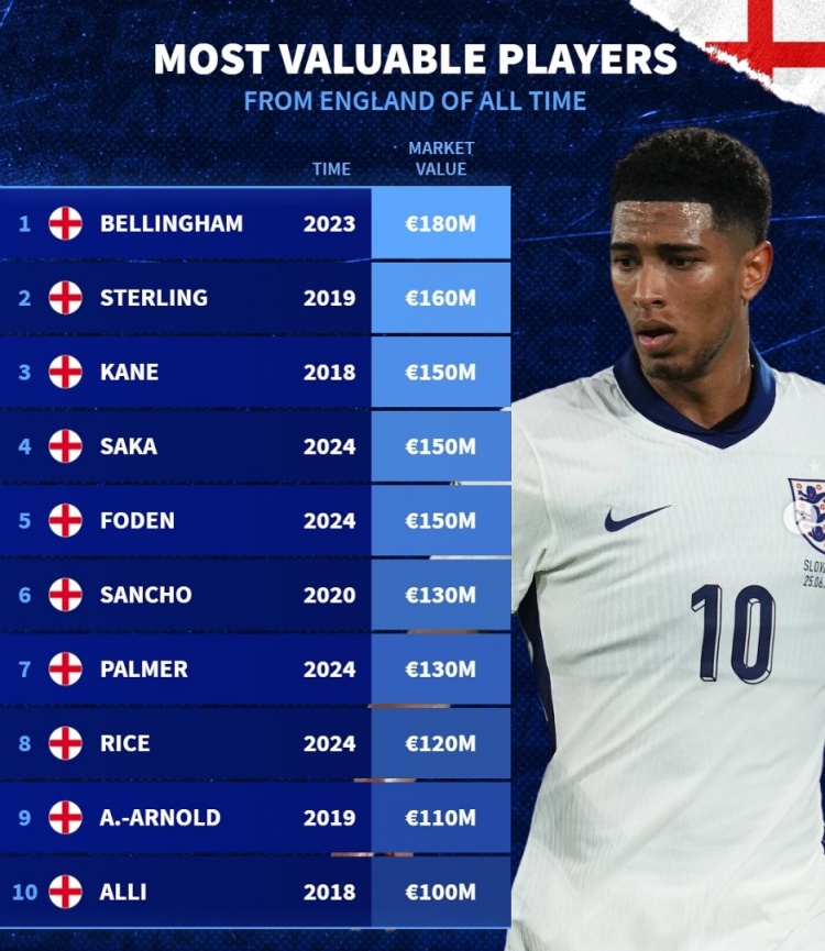 2025-03-25 05:42:31德轉(zhuǎn)列英格蘭隊(duì)史身價(jià)前十:貝林厄姆1.8億,斯特林、阿里均上億