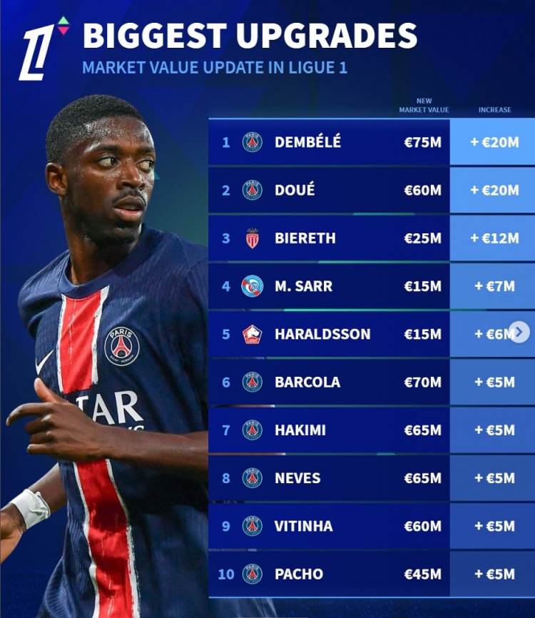 2025-03-25 05:42:49法甲身價更新升值榜:登貝萊&杜埃均上漲2000萬歐,比雷斯在列