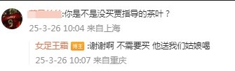 有網友在評論里留言提問“你是不是沒買賈指導的茶葉?”對此王霜回復寫道:“謝謝啊,不需要買,他送我們姑娘喝。”