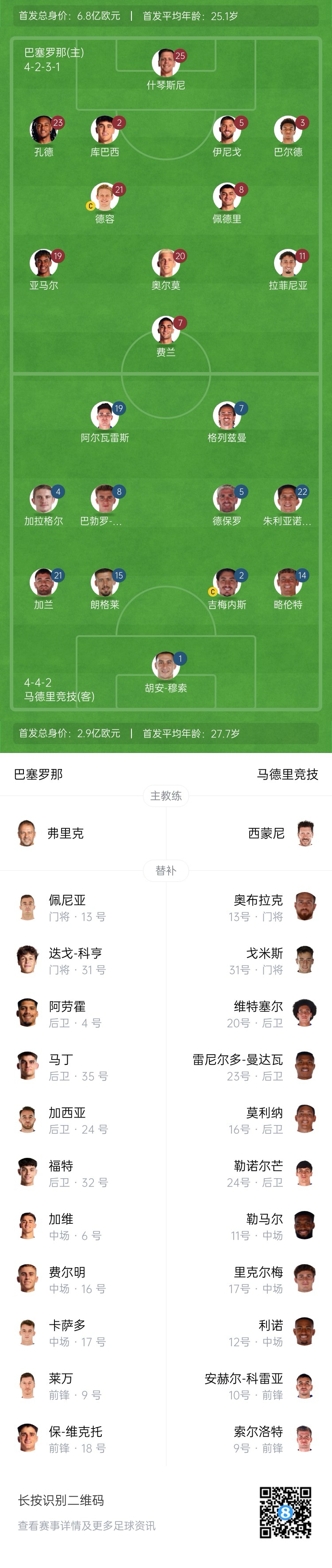 巴薩首發:25-什琴斯尼、2-庫巴西、3-巴爾德、5-伊尼戈-馬丁內斯、23-孔德、8-佩德里、20-奧爾莫、21-德容、7-費蘭-托雷斯、11-拉菲尼亞、19-亞馬爾